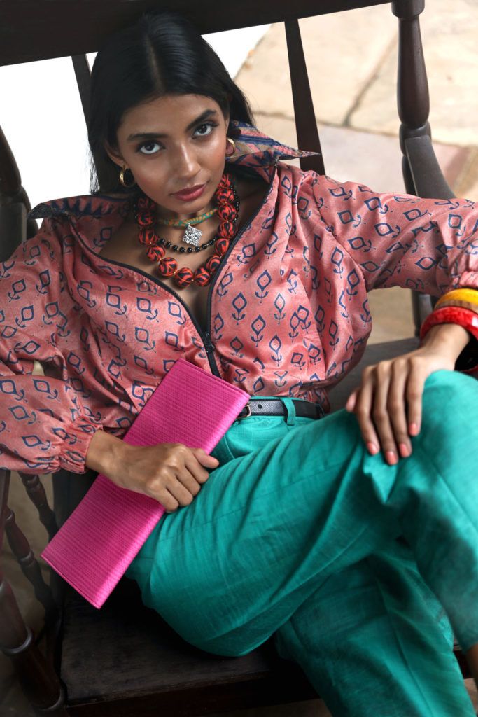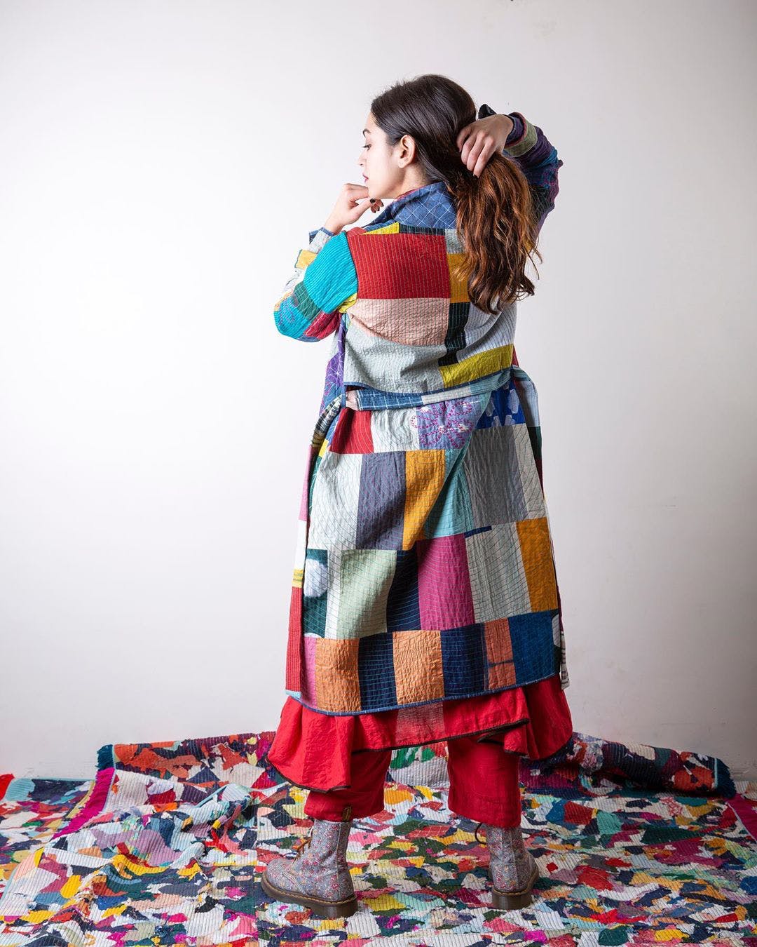 One brand alone may not have a significant impact on sustainability, but if many brands and studios adopt sustainable practices, it can create a chain reaction and have a positive impact overall. For example, if a significant number of studios in Delhi implement practices to prevent fabric waste, it can make a difference. Each person should do their part and see how it can inspire others to do the same. The idea of exploring the possibilities of weaving had been on my mind for quite some time. With our previous collection, Hakimo, we were able to create something truly special by pairing our waste with the weaving expertise of another studio. However, this approach also had its downsides. The transportation required to move waste and textiles between different studios adds unnecessary carbon emissions to the equation. By streamlining the process and utilizing our resources in-house, we can reduce our environmental impact and still produce beautiful, sustainable products. Our design inspiration drew from the intricate craft of Khatamband, a wooden ceiling art that uses geometrical patterns. To mimic the third dimension, we opted for a 3D fabric in our creation. The result? A unique and visually dynamic piece that adds visual interest and depth to any space. Apart from that, we wanted to create a collection of commercial clothing items such as jackets, trench coats, and bomber jackets. They mainly targeted an age group of 35 to 40 years old, as sustainable clothing is expensive. However, they also considered catering to a younger audience during the design process.